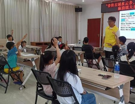 夏已至,天渐热,我们渴望着清凉感,正如我们热切地想要体会外语的魅力。在本次广州新华学院122cc太阳集成游戏向日葵志愿服务队与大步文化馆携手开展的大步向阳配音活动中,我们惊喜地发现到家长和小朋友们对学习外语有着浓厚的兴趣。在两个月的学习外语配音课程里,身披黄色马甲外套的志愿者和孩子们一起沉浸在大步村新时代文明实践站里的外语世界。