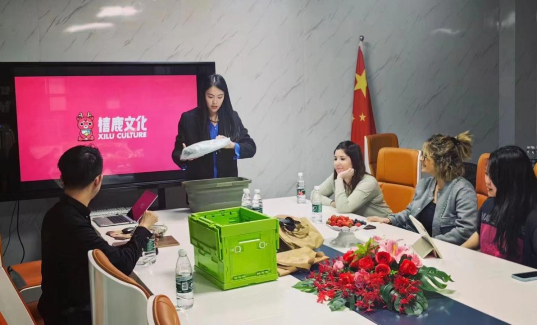 罗韩鑫作为西语翻译陪同西班牙人俱乐部工作人员前往公司开会(右一)