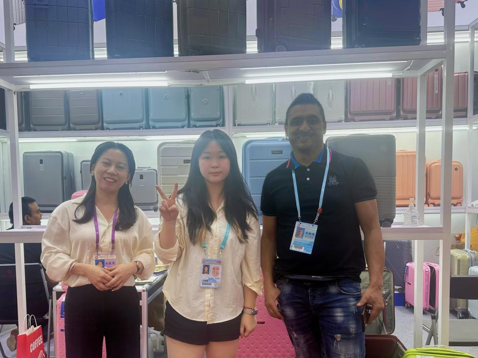 罗韩鑫作为西语翻译陪同哥伦比亚客户前往广交会参展(左二)