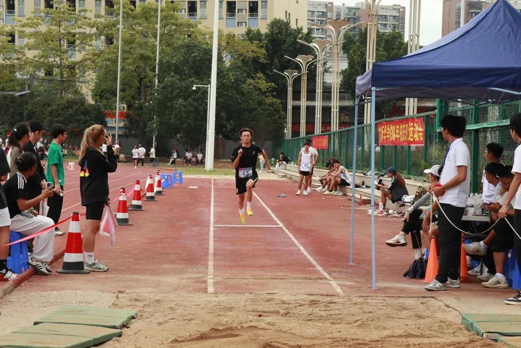 沙坑旁,跳远比赛引人注目。运动员们如矫健的飞燕,急速助跑,每一步都带着风的呼啸。踏板上,他们纵身一跃,身体在空中舒展开来,似展翅翱翔的雄鹰。那瞬间,时间仿佛静止,只见他们划过一道优美的弧线,朝着沙坑而去。双脚落地,沙粒飞溅,在沙坑中留下深深的印记,这精彩的一跃,是力量与技巧的完美结合,是向着更远目标的勇敢挑战。