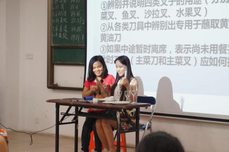 餐桌礼仪大比拼,考验选手西方用餐文化知识。各队的两名队员根据所给要求,面对桌子上的刀叉杯盘,淡定从容地做出相应的展示讲解,随后由礼仪上台做正确的示范。在此环节中精彩不断呈现,同时也不乏各种笑料,让现场笑声与掌声不断。