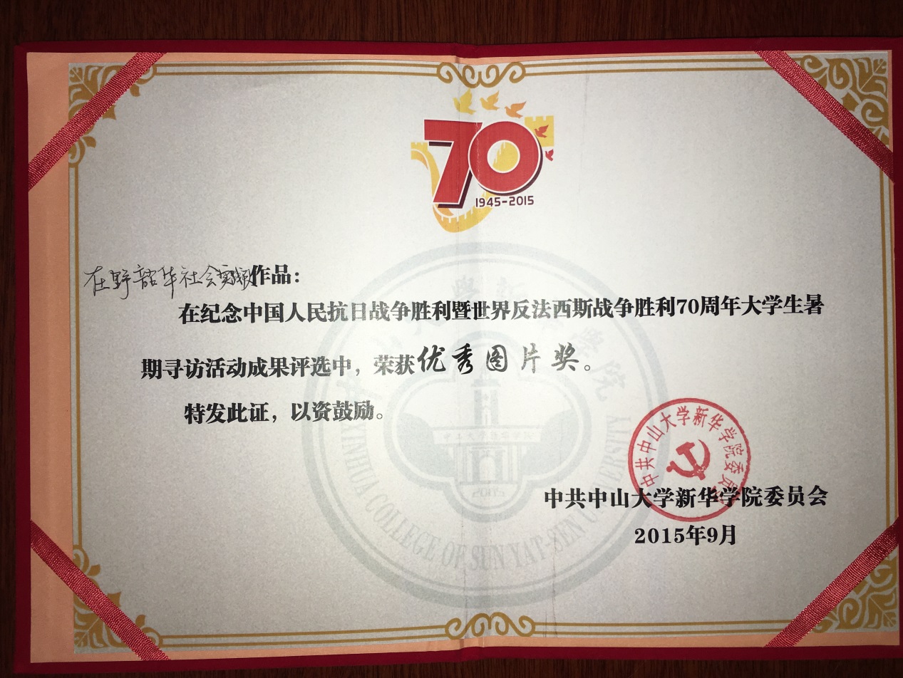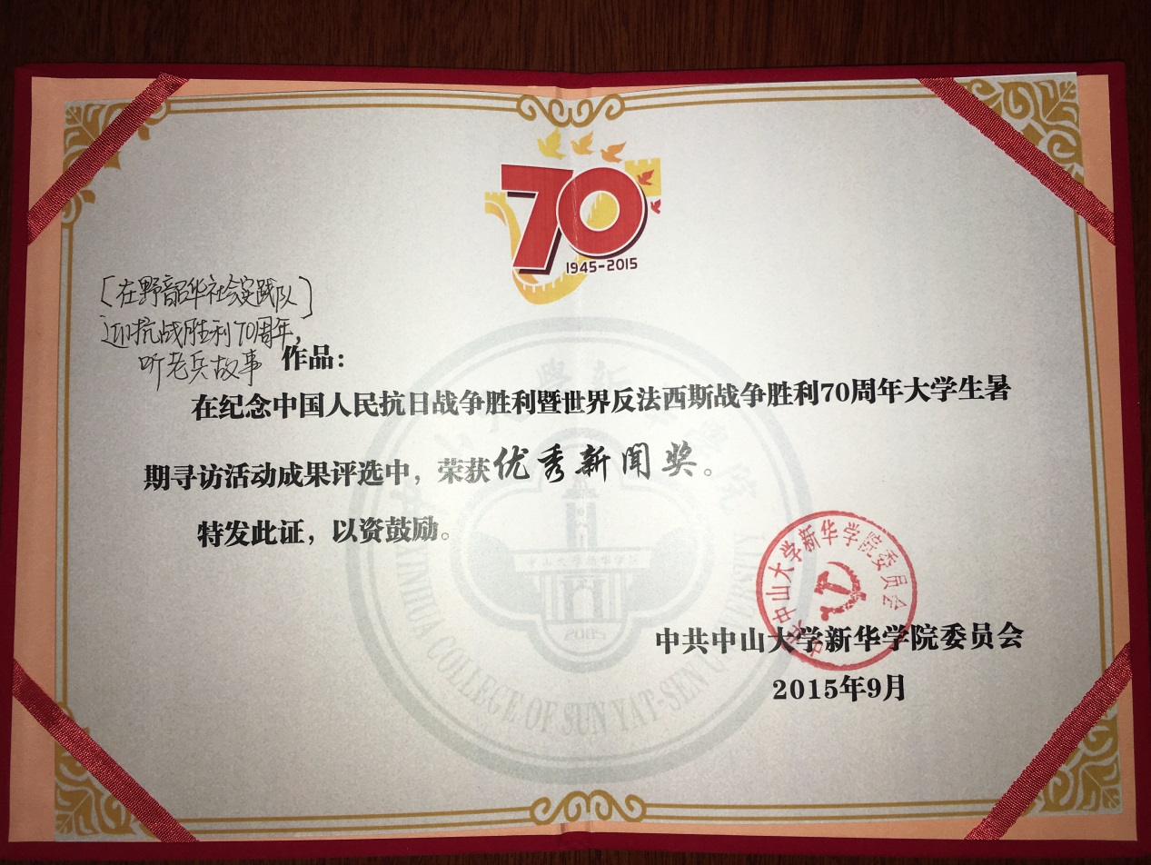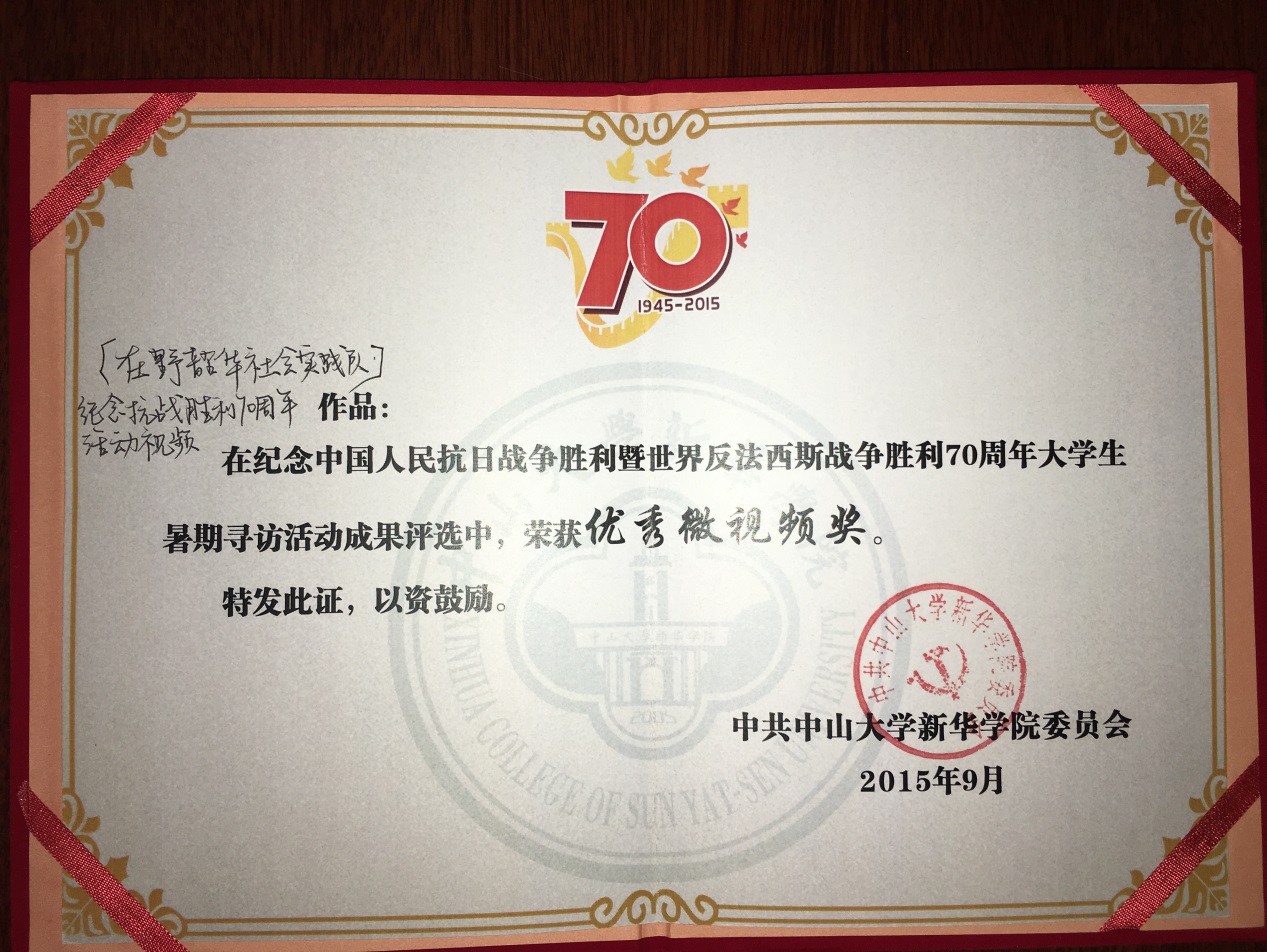 在此次活动中,外国语言文学系 “在野韶华”团队也在我院纪念抗战胜利70周年活动中共荣获“优秀微视频奖”、“优秀新闻奖”、“优秀图片奖”三个奖项。