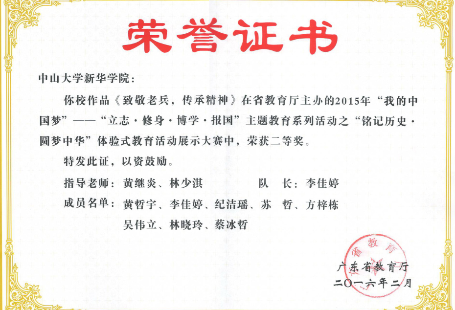 祝贺我院外国语言文学系“在野韶华”团队作品《致敬老兵,传承精神》在省教育厅主办的2015年“我的中国梦”----“立志·修身·博学·报国”主题教育系列活动之“铭记历史·圆梦中华”体验式教育活动展示大赛中,荣获 二等奖。