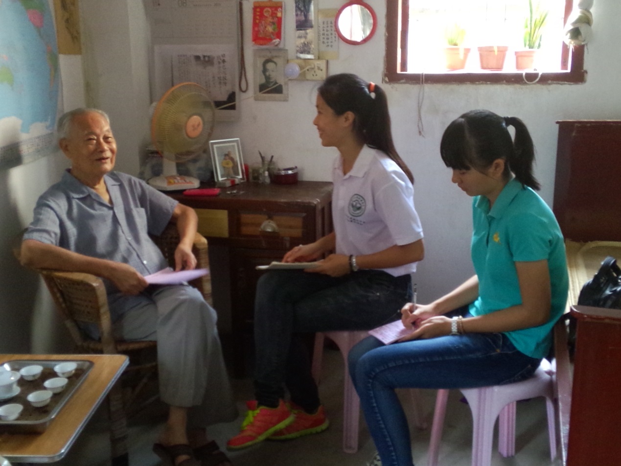 2015年暑期,在外国语言文学系副主任黄继炎老师,办公室副主任林少淇老师的带领下,“在野韶华”社会实践团队一行8人在潮汕关爱老兵志愿队的大力支持下,我们探访了重庆军令部第二厅四处上尉连长罗春晖同志、青年军战士陈文喜同志、陈纳德飞虎队的翻译员叶继纲同志、苏北挺进军战士郭予广同志、新一军30师直属工兵营第一连工兵林卓群同志、空军马文超同志,并对此次活动进行了文字、图片、视频等多种素材的记录,力求将老兵的寄语与生活状态真实记录下来,分享给更多人知道,用实际行动去关爱老兵,让老兵们能更好地享受他们为之奋斗的幸福生活。