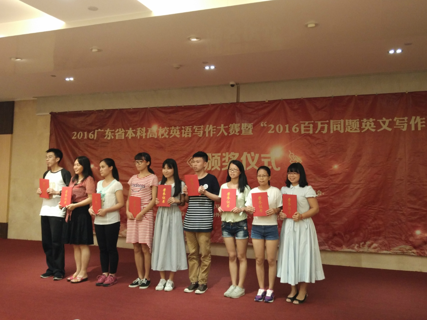 6月26日,2016广东省本科高校英语写作大赛暨2016“百万同题英文写作”活动决赛在广州举行。来自我院外国语言文学系14级英专学子高旭娜荣获英语专业组二等奖。经贸系15级投资学专业学生唐若昕则荣获公共英语组三等奖。