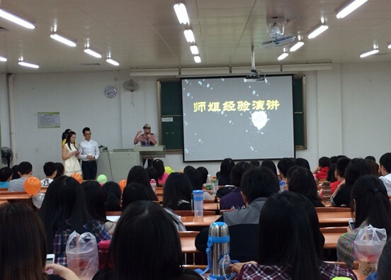 讲座开始,先由李贻老师及袁侥蔚老师先后上台给大家讲授了各题目的应试技巧及应考心理调整的方法,帮助大家克服紧张心情,调整好心态迎接专四。接着大三的五位师姐轮流跟大家分享了专四经验及各自的不同应试技巧,并与大家积极互动,为在场的师弟师妹排忧解难。