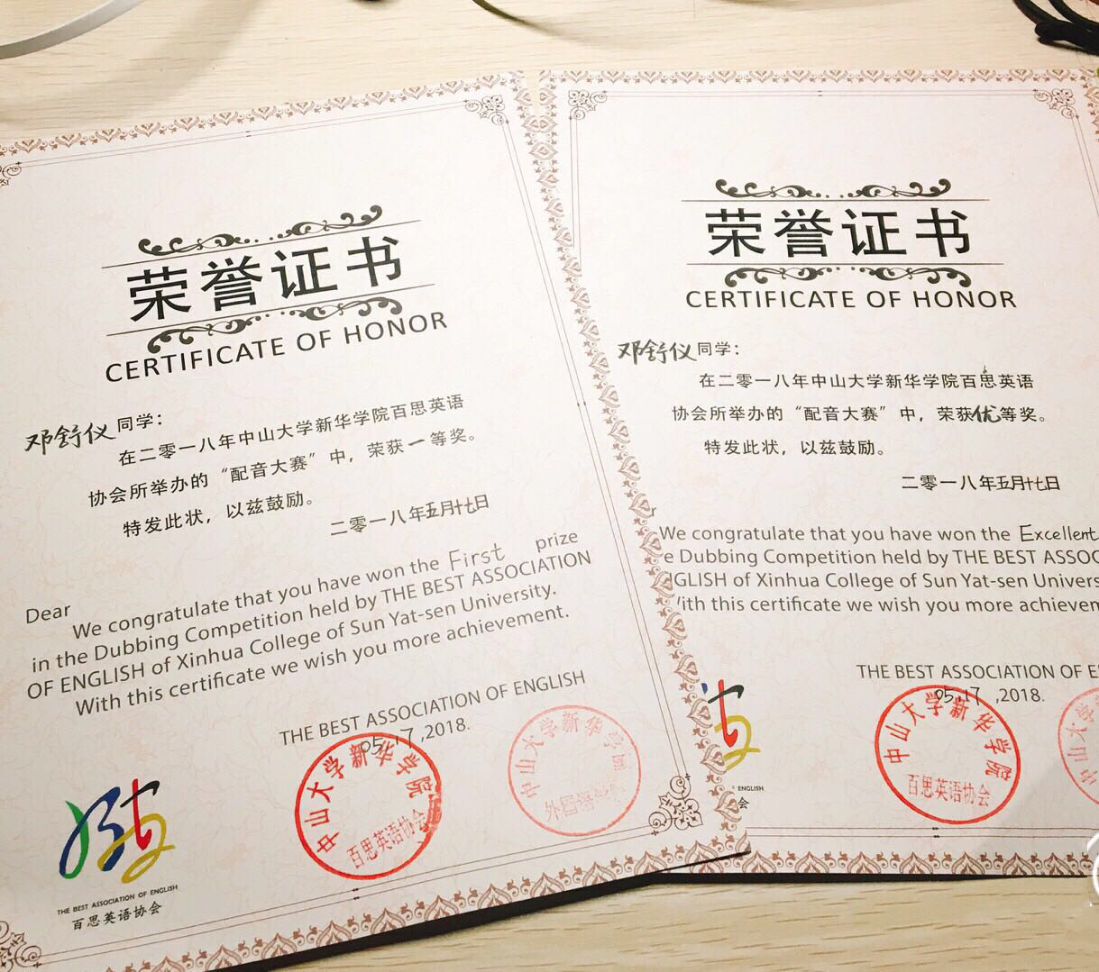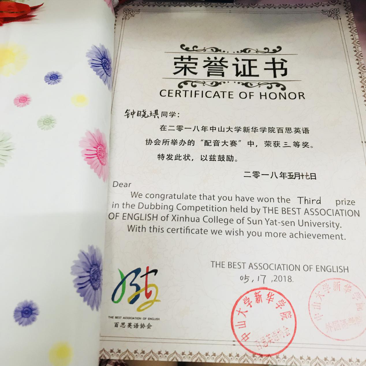 百思英语协会自主设计的精美双语证书