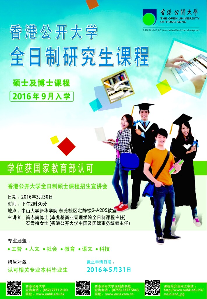 近日,我院拟开展推荐毕业生赴香港公开大学读研的宣传工作。香港公开大学李兆基商业管理学院应邀来我院做全日制硕士招生宣讲会及答疑,相关硕士课程信息可浏览:http://www.ouhk.edu.hk。欢迎各系有意向赴港深造的学生踊跃参与。烦请各系大力支持,转发通知及组织学生参加宣讲会。