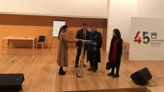 阿威罗大学校长Paulo Jorge Ferreira教授对我校代表团的到来表示欢迎,王庭槐校长代表我校致以衷心的感谢,双方校长互赠纪念品并合影留念。