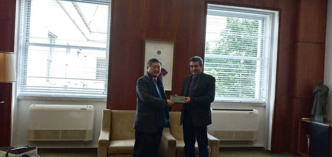 会谈结束后,双方领导互赠纪念品 (左起:我校校长王庭槐、里斯本大学副校长João Barreiros)