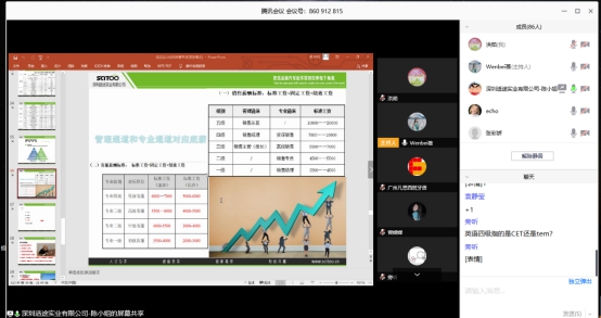 第三位出场的是深圳适途实业有限公司的人事招聘专员陈春绘小姐。她用公司专业的介绍视频资料,开启了今天的讲解。视频充分展示了适途实业公司的雄厚实力和跨国经营的规模,以及公司与时俱进、青春活力的团队和文化。随后,陈春绘小姐通过PPT文件共享的方式,进一步解答了公司人力资源的布局、同学们潜在的发展前景以及与公司岗位的匹配问题。最后,会议在同学们积极的互动环节中落下帷幕。大家意犹未尽、摩拳擦掌的心情,体现在屏幕里不停闪烁的消息里。
