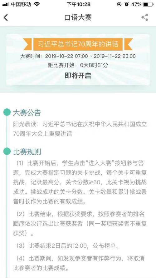周二有领读, 领读材料《习近平总书记70周年讲话》,签到小程序里有,“FIF口语训练”APP也有(打开“FIF口语训练”APP-我的-比赛专区-习近平总书记70周年讲话)