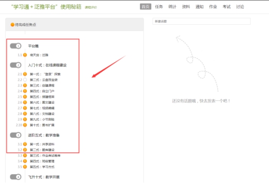 各位教师在个人学习页面都有一门“学习通+泛雅平台”使用秘籍的课程。平台每个功能使用方法都做成短视频,可进入学习使用方法。