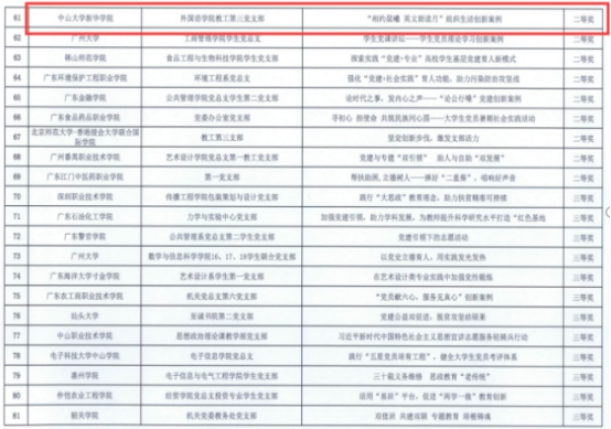 近日,从《中共广东省委教育工委关于公布高校基层党建工作创新案例评选结果的通知》中获悉,由我院教工第三党支部组织开展的“相约晨曦 英文朗读月”组织生活创新案例荣获中共广东省委教育工委高校基层党建工作创新案例评选活动——基层党支部组织生活创新案例二等奖。