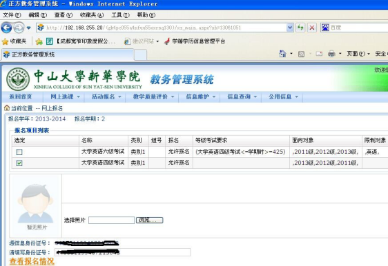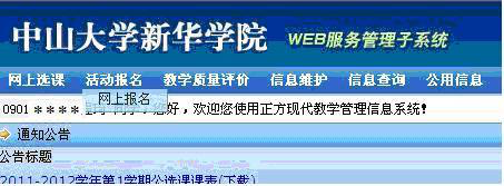网址:登录教务系统(内网:http://192.168.255.71;外网:http://jw.xhsysu.cn(电信)。