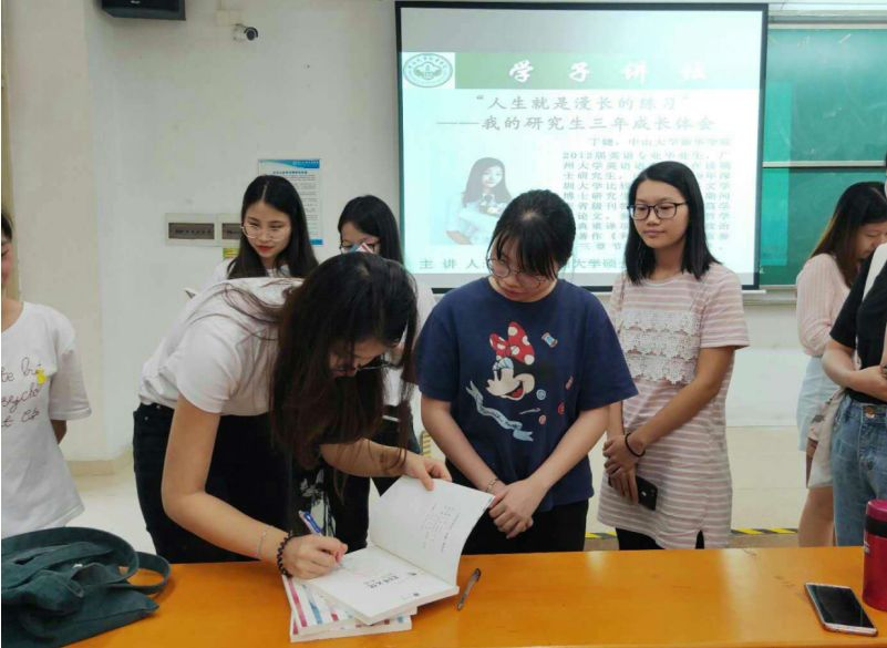 赠书仪式结束后,伴着同学们的期待,丁婕师姐开始她的精彩演讲。讲座现场,丁婕师姐从自身经历出发,分享了研究生生活中关于导师、学习方式、学术训练、学术交流等方面的内容。她指出摆脱焦虑的最好方法是立刻行动起来,以积极的心态合理规划生活,“把困难当成符号,越过它”。丁婕师姐还讲到了专硕与学硕的区别,她因为喜欢学术理论研究而选择了攻读学术硕士。她强调:个人定位很重要,不要轻易做决定,要了解自己究竟是适合学硕还是专硕。