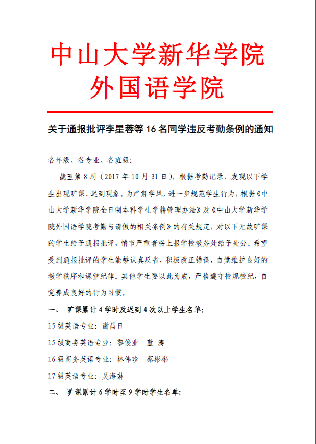 关于通报批评李星蓉等16名同学违反考勤条例的通知