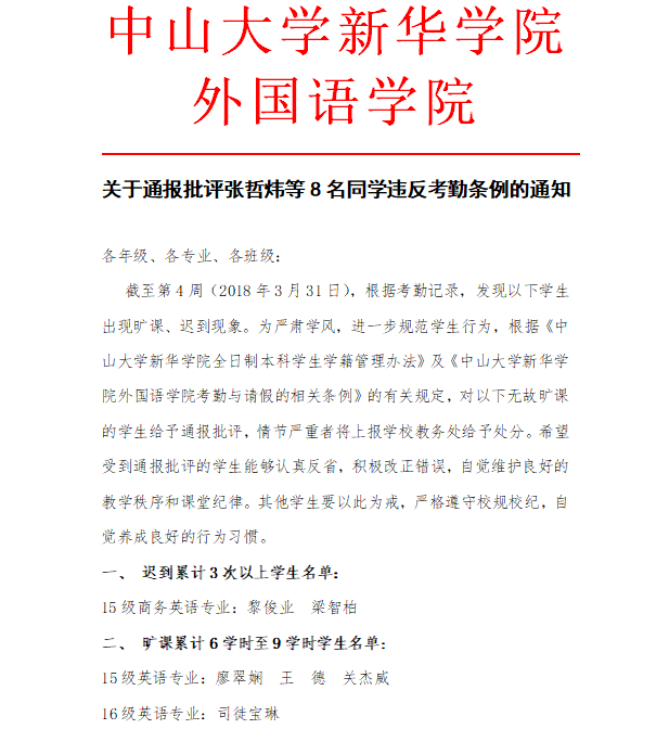关于通报批评张哲炜等8名同学违反考勤条例的通知