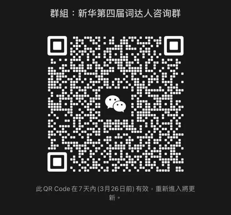 报名时间为即日起至2024年3月31日。参赛选手务必于截止日期前关注微信公众号“词达人”,进入“学生端”,使用右上角的“扫一扫”功能,扫描下方的本校专属报名二维码。进入报名界面后,参赛选手须如实填写本人姓名、学号、组别等信息,确认提交完成报名。填报信息与竞赛成绩、获奖证书挂钩,如果填报错误或经核查不实,将可能被取消竞赛成绩。