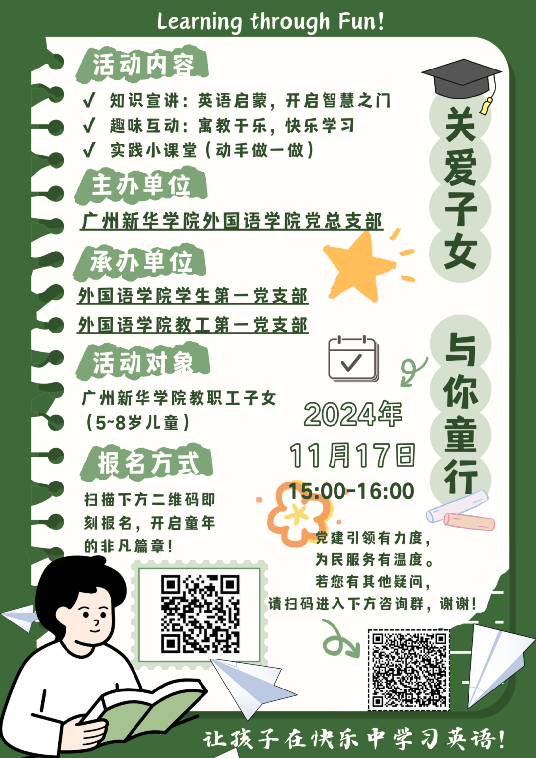 党建引领有力度,为民服务有温度。在全球化的浪潮中,英语不仅是沟通的桥梁,更是开启世界之门的钥匙。我们深知,提升英语能力对于孩子们的成长至关重要。为此,广州新华学院122cc太阳集成游戏党总支以高度的责任感和使命感,精心策划了以“关爱子女,与你童行”为主题的公益英语班,为教职工子女提供英语学习的交流平台。
