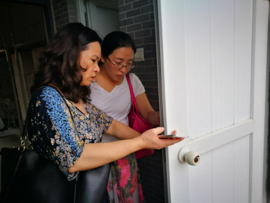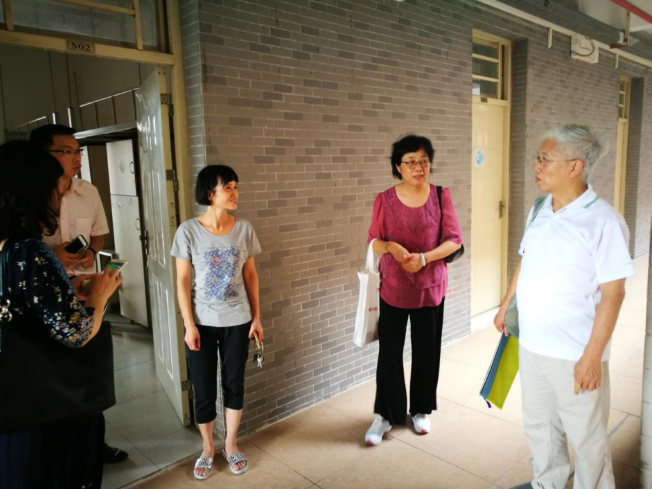 廖益清院长及殷丹书记在检查学生宿舍门把手使用情况