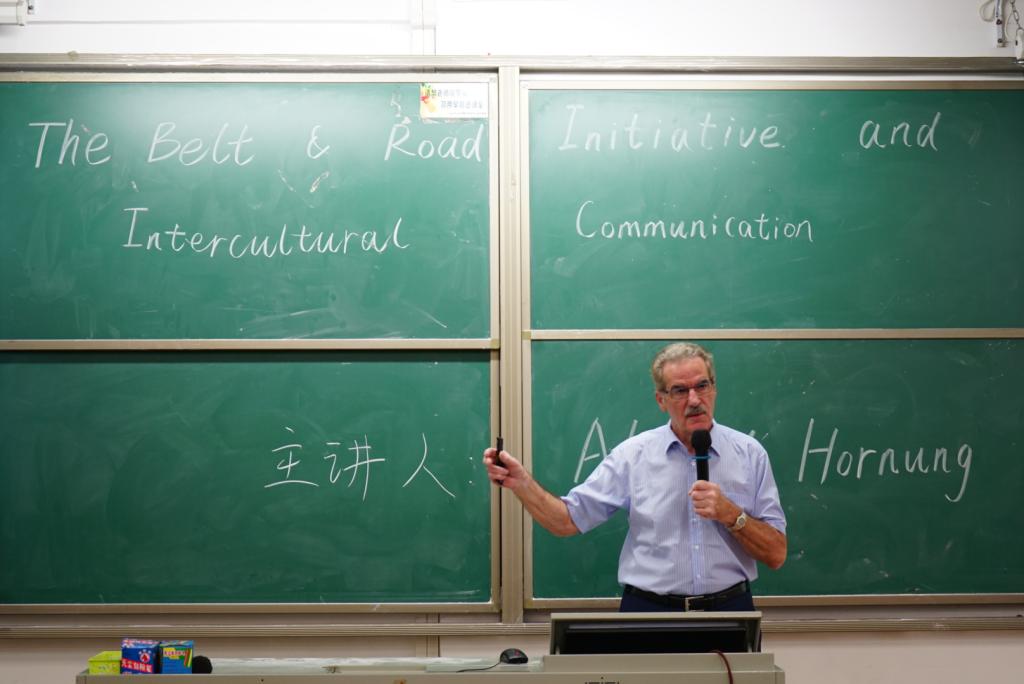 Hornung教授讲座分为“丝绸之路”、“探索与发现”、“跨文化交际”及“新丝绸之路(一带一路)”四个板块。以丝绸之路的历史溯源为引子,Hornung教授分析了不同历史时期丝绸之路对中国及其他国家政治、经济的影响,并重点阐释了“一带一路”倡议对跨文化交流的促进作用。Hornung教授旁征博引,高度赞扬了中国丝绸之路的意义,丝绸之路早在数千年前就连接了欧洲、亚洲和非洲,使东、西方经济、文化发生了紧密而频繁的交流。Hornung教授还阐释了中国儒家思想对美国政治家本杰明·富兰克林的深刻影响。本杰明·富兰克林极为推崇孔子“大学之道,在明明德,在亲民,在止于至善”的思想,并称赞儒家思想是一种至高无上的智慧。通过Hornung教授生动的讲述,大家对丝绸之路有了更深刻的理解。
