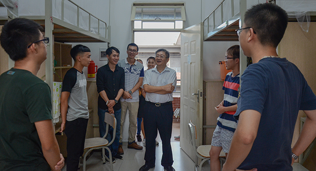 周云书记在新生报到点与工作人员亲切地交谈,详细地了解了各专业的报到情况。深入走访新生宿舍,了解新生住宿情况,针对有些宿舍水电问题及时联系相关部门第一时间进行检修,让新生满意入住。同时,针对从高中到大学该如何转变角色这个问题,周书记劝勉新生要及时调整好生理、精神等方面的状态,在学习与日常生活中要发扬好吃苦耐劳的精神,将外部的压力转化为自身努力学习、积极向上的动力,充分利用学院雄厚的师资,提升自己,成就自己。