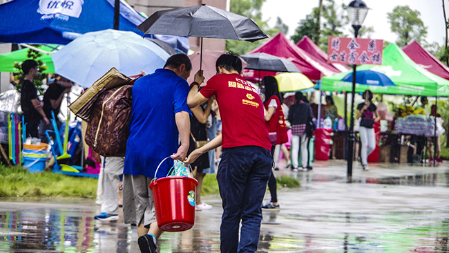今天送孩子入学的刘叔叔和记者分享道,之前听朋友孩子说迎新志愿者们都很热情,会有很多人来帮忙。起初我还怕自己和孩子搞不定,但今天遇到很多志愿者,都很热情,特别是在雨中跑来为我们撑伞的男同学让我很感动,感谢他们提供如此暖心的帮助。