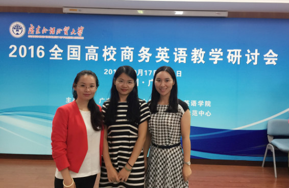 10月17日至21日,2016全国高校商务英语教学研讨会在广东外语外贸大学召开。会议主要围绕商务英语专业课程建设、教学理念、教学方法以及测试与评估等一系列涉及商务英语专业发展和建设的重大问题展开交流与探讨。来自全国60余名商务英语专业负责人和骨干教师代表出席了会议,我系商务英语专业副主任何瑜、国际贸易教研室主任李文蓓、基础课教研室主任袁侥蔚应邀参加了此次研讨会。