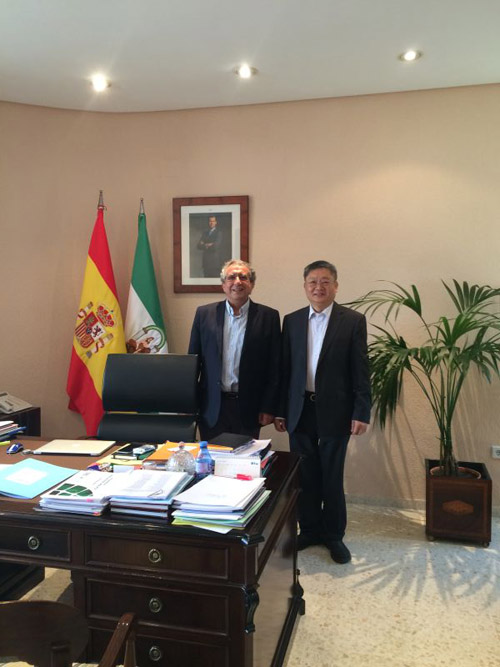 王庭槐院长(右)的到访受到了马拉加大学校长José Ángel Narváez Bueno(左)的热烈欢迎