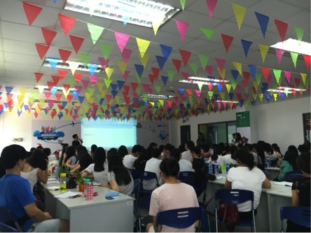 7月17日晚,学生们进行了资源利用的培训,学习如何最大程度利用阿里巴巴的后台资源如顶级展位、P4P、FRQ等进行营销和产品发布。