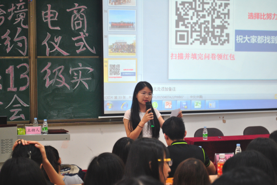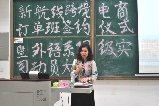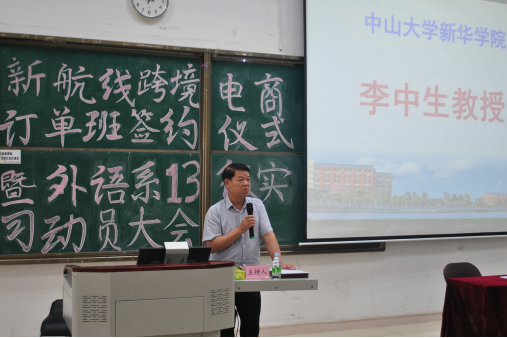 2016年6月13日下午,新航线跨境电商订单班签约仪式暨外语系2013级实习动员大会在我院东莞校区定静②D203举行。出席此次大会的学院领导及嘉宾有:中山大学新华学院副院长李中生,教务部部长尹小川,外国语言文学系主任廖益清,广东新航线跨境电子商务服务有限公司副总经理张何文先生及该公司电商总监陈冰杰先生。外语系商务英语专业副主任何瑜,外语系13级实习指导老师及13级全体师生也积极参加了本次活动,并共同见证了新航线跨境电商订单班签约仪式的重要时刻。大会由外语系洪茹老师担任主持。