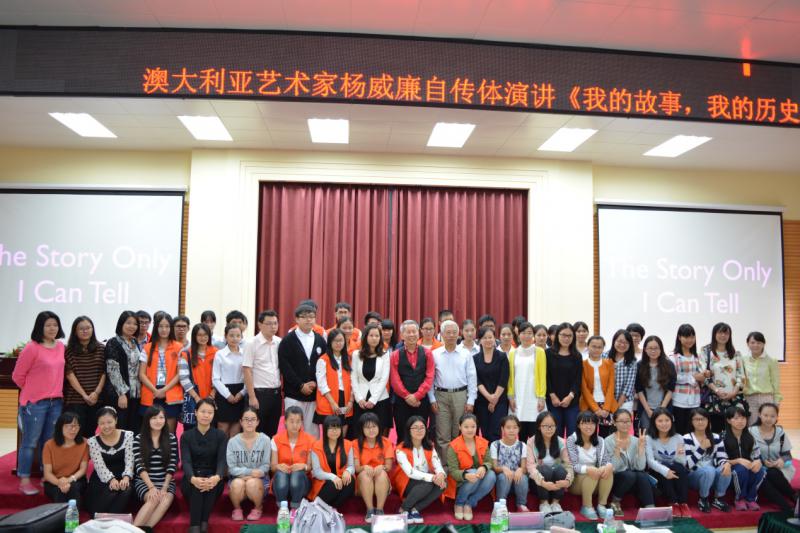 杨威廉先生以“独白”的艺术形式为我们带来了独特的“The Story Only I Can Tell”表演, 全场从头至尾鸦雀无声,沉醉在他美妙、舒缓而又深情的叙事中。杨威廉先生是第三代华裔澳大利亚人,他的一生充满传奇色彩。讲座伊始,他为我们介绍了他的出生地及他的家庭情况。之后,他带领我们一起领略他的人生之旅。小时候,他曾因华裔身份而遭到同学的欺凌,让他觉得生为华人仿佛是一个可怕的诅咒。大学期间他学习了建筑学,但这并不是他最终的追求,毕业后,他成为了剧作家,后来,他发现自己最喜爱的是摄影,便开始了他摄影师的生涯。他曾痛苦过,迷茫过,但他坚信自己能成为一名艺术家。他的坚持让我们深受感动,也给同学们精神上极大的鼓舞。接着,杨威廉先生说明他现在信奉道家思想,特别喜欢中国的黄山,表示在中国的很多体验是在澳大利亚所体会不到的。这些都让同学们感受到杨威廉先生对中国文化的热爱。