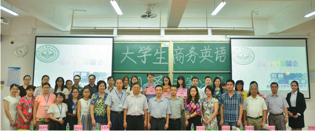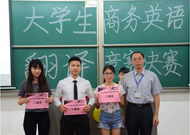 东莞首届大学生商务英语翻译大赛决赛领导、嘉宾及获奖选手合影