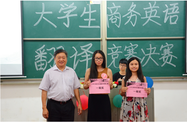 王庭槐院长为口译组、笔译组一等奖获得者林婷婷、李烨同学颁奖