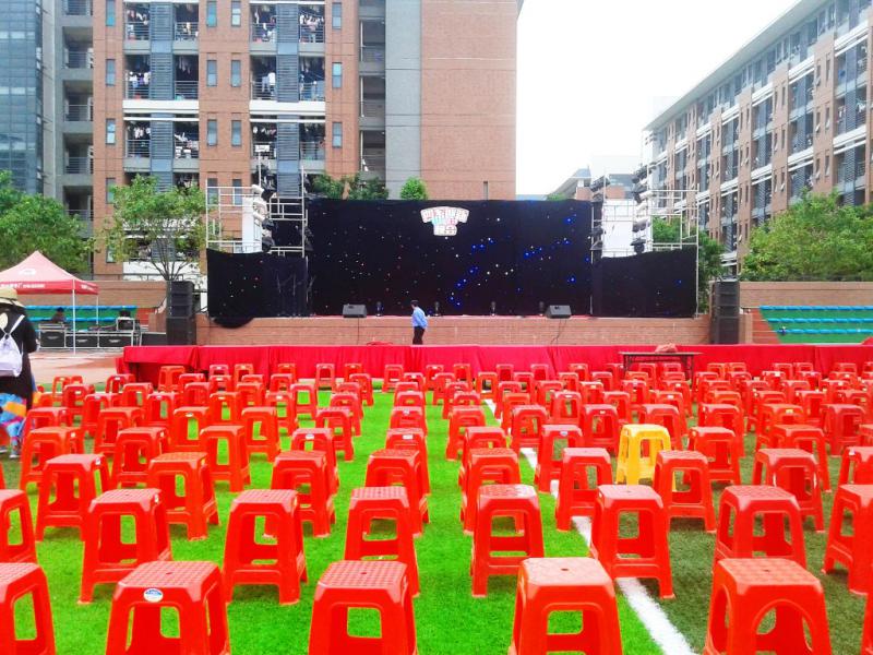 时值下昼,绵绵乌云笼罩,凉风袭人。会场上,繁忙的身影无处不在;舞台上的那片繁星闪烁着;足球场上的桌椅整齐有序排列着;食物区的饮料美食静待着;一切就绪,等待着新生的到来。不知是辛勤的汗水蒸发,抑或是上天感动的泪水洒落,天空下起毛毛细雨,时而寒风呼啸,时而大雨倾盆,每个人的心情随之忽高忽低。上天眷恋着努力的人们,约莫晚上七点一刻,雨停了,新生们陆陆续续入场就座,场内座无虚席。
