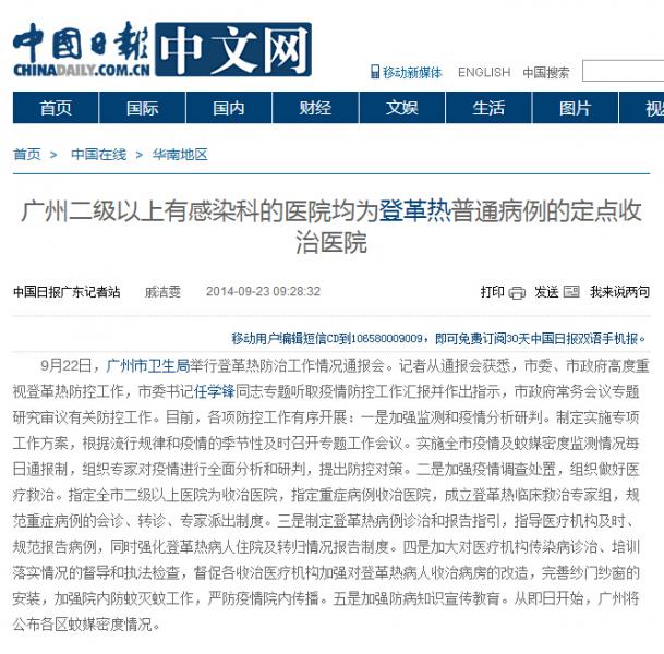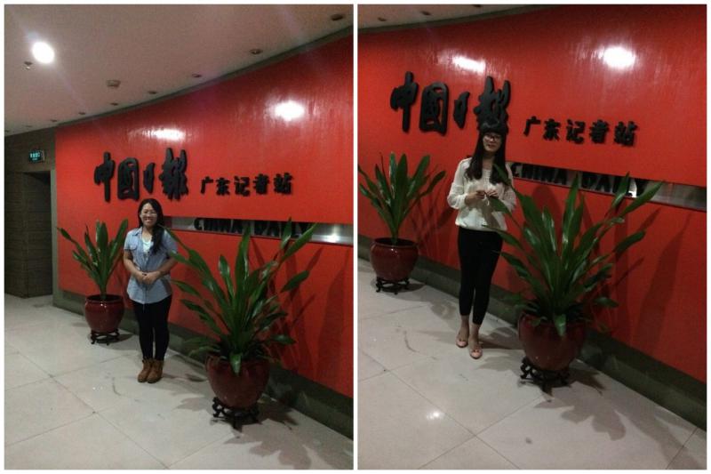 在此之前,我系2011级学生戚洁雯率先通过中国日报社广东记者站的层层选拔,于2014年8月4日正式开始实习。实习期间,戚洁雯同学虚心向记者站老师学习,发挥自身主观能动性,积极地分担各类事务,认真踏实地完成好分配的任务,深得记者站站长的肯定。在转岗至采编部后,在站长的指导下完成了关于9月22日广州市卫生局举行登革热防治工作情况通报会的新闻稿,并于9月23日发布至中国日报中文网(网址为:http://cnews.chinadaily.com.cn/2014-09/23/content_18644403.htm)。我系第二批实习生在中国日报社的筛选下,由2011级杨思莹同学获得实习岗位,于2014年9月15日正式上岗。