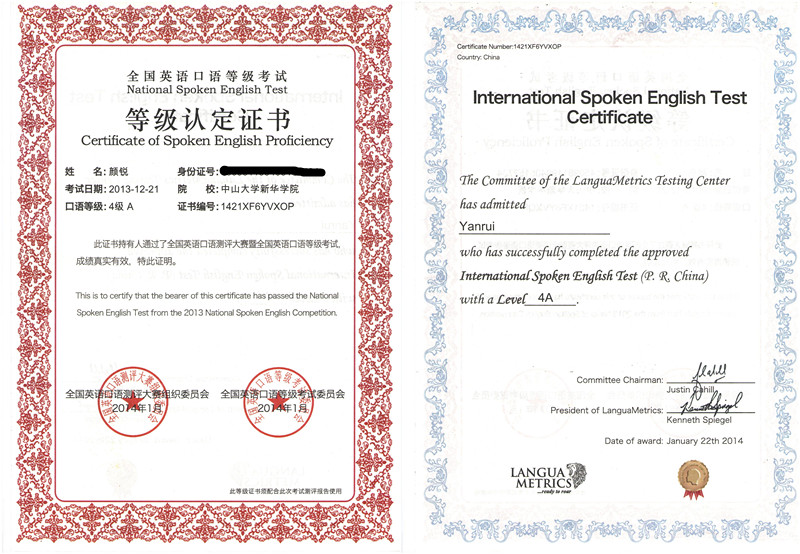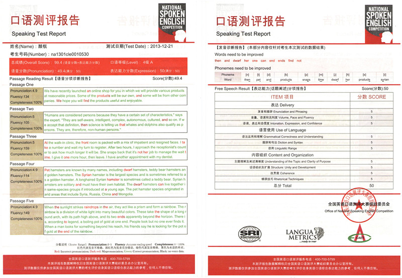 所有参赛学生通过组委会提供的考试终端参加历时将近30分钟的计算机口语测试(分为篇章朗读和话题阐述两个部分)。测评过程全部传输至美国语言测评中心进行测评处理并生成评报告,从准确度、流利度、完整度、韵律度、可被理解度、近母语值等方面对参赛选手的英语口语表达能力进行评估。口语测评报告详细地指出了学生的哪个单词、哪个音节发音错误,十分有助于学生自己改正提高发音质量。依据测评报告,每位参赛选手都获得一份由美国SRI口语测评系统判定的口语等级认定证书。目前,获奖证书、口语等级证书和口语测评报告都已经寄到了外国语言文学系。另外,外语系欧衍伽老师获得中国教育技术协会和全国英语口语测评大赛组委会颁发的“优秀组织奖”。