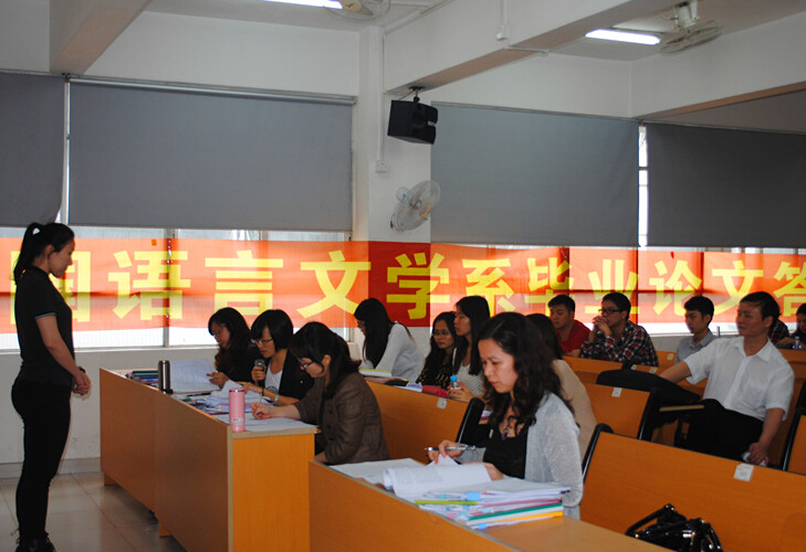 按照学院教学科研工作部统一要求,我系在4月23日和5月10日,安排了三场毕业论文答辩。出席的评委专家和工作人员有:廖益清副教授、黄继炎副教授、督导董丽明副教授、古国耀教授、何瑜老师、陈绮雯老师、黄珍老师、刘霞老师、李明娇老师、欧衍伽老师。按照学院要求,答辩学生都出席参加答辩,未参加答辩的出席旁听。