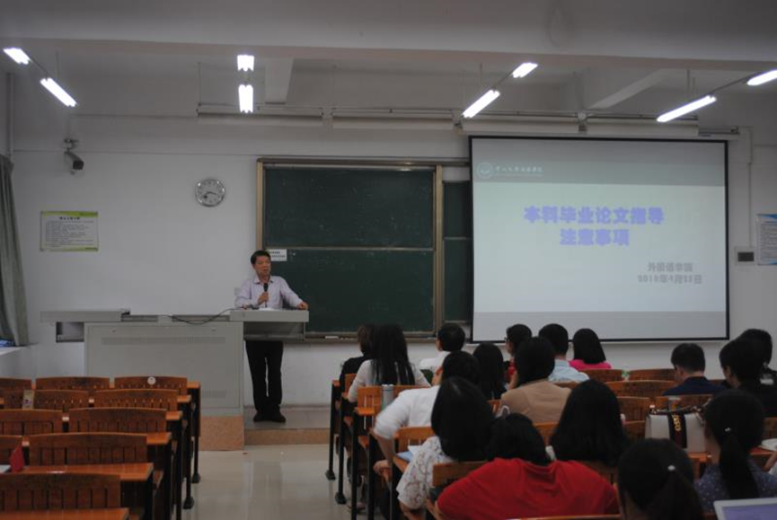 我校副校长李中生发表讲话,首先他肯定了外国学院毕业论文指导工作的认真细致。其次他对毕业论文指导提出三点要求。第一,国家的导向是要本科毕业生多写应用型论文,因此,我校现在开始需加强指导学生撰写应用型论文。第二,本科毕业生的论文要求浅入深出,即语言表达要通俗易懂,内容深入独到有意义。第三,要加强毕业论文开题报告的指导,避免学生由于选题中途放弃。