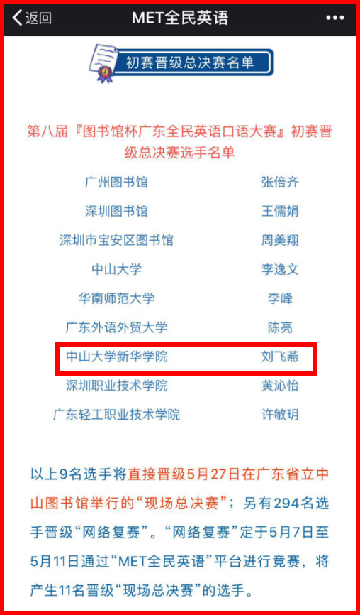 据悉,经过网络初赛直接进入全省总决赛的选手共计9名,挺进网络复赛的选手共计294名,且所有复赛选手将共同角逐进入总决赛的11个名额。网络复赛将于2018年5月7日至5月11日通过“MET全民英语”平台进行竞赛,总决赛将于5月27日在广东省立中山图书馆举行。