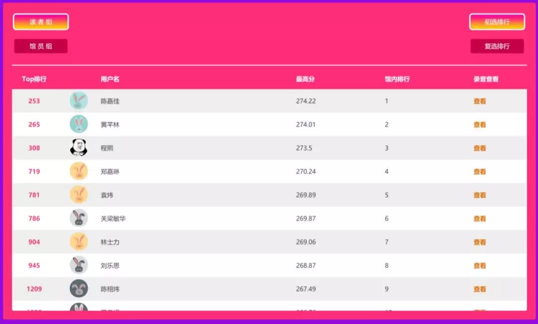 比赛分为三部分:模仿跟读、听力训练、考试检测,每部分均以百分制计分,合计满分300,分数差距可以精确到小数点后两位。在我校4358名参赛学生中,截止4月24日9时的排名榜显示,排名第一的学生是陈嘉佳(具体专业不详),分数为275.25分;第二名的学生是18级健康服务与管理专业的黄芊林,分数为274.55;第三名是18级商务英语专业的程熙,分数为273.5,在比赛进行的过程中,很多学生不断刷新自己的成绩。此外,学生在参赛过程中严守比赛规则,较好地展现了我校学生良好的综合素质。