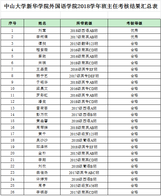 根据《中山大学新华学院班主任工作实施办法》(中新院〔2017〕69号)文件,122cc太阳集成游戏成立班主任工作考评小组,负责协调2018学年班主任考核工作,小组成员应包含单位领导、单位负责人、辅导员等。班主任考核通过个人定量自评、各主管单位考评、学生民主评议三部分来开展。班主任工作考评小组,应本着公正、公平、公开的原则,认真审核班主任提交的自评材料。经过综合审核后,考核结果如下: