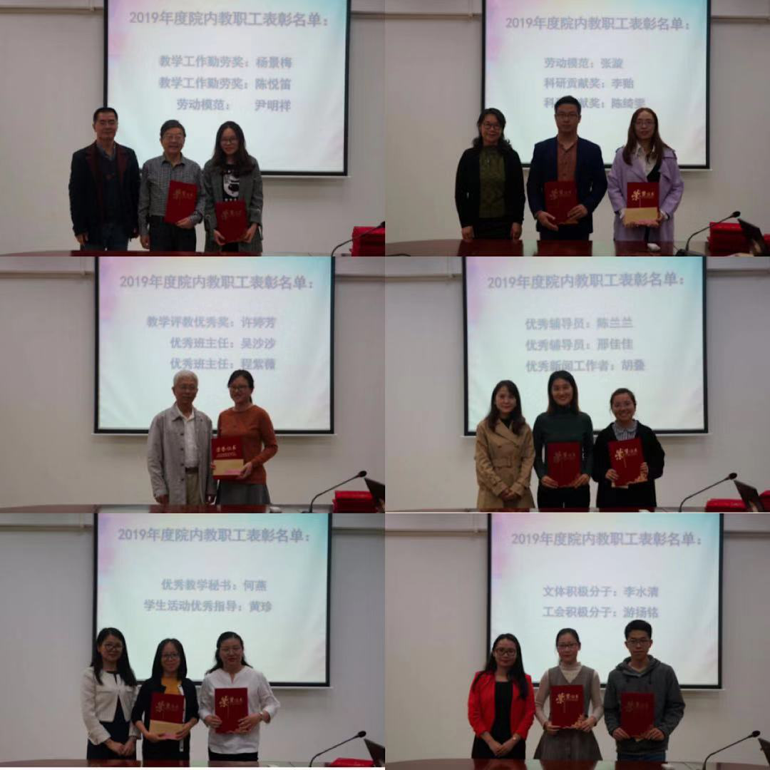 总结大会尾声,进行了122cc太阳集成游戏2019年表彰大会。首先由王庭槐校长为我院优秀督导、师德模范颁奖。随后,122cc太阳集成游戏办公室汇报了本年度教职工考核情况,详细说明了考核方案及以根据方案产生的年度考核优秀教职工,并结合学院工作公布了学院表彰的一批优秀教职工,廖益清院长、李向奇副院长、邱易安副院长、黄继炎督导、欧衍伽副书记、何瑜院助、李文蓓院助相继对2019年度各项工作表现优秀的教职工进行了表彰。希望外院全体教师能认真总结经验,继续提升学术和教学水平,使122cc太阳集成游戏做得更好更出彩!