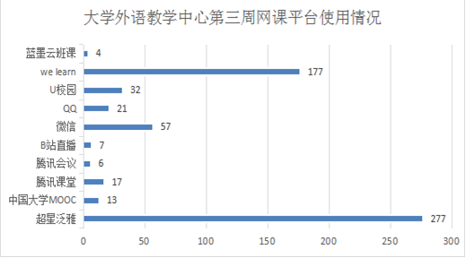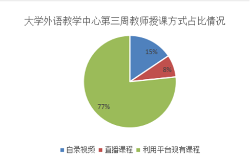 本周大学外语课程开课年级为18级和19级,在线教学教师人数为57位,计划开课的在线教学课程门数为14门,实际开课的在线教学课程门数为14门,在线教学的课程门次数为295门次,在线教学的班级数为295个,在线教学的学生人次数为14235人。教师授课的方式主要包括直播、自录视频和利用平台现有课程,开展网课教学活动使用的网络教学平台主要包括超星泛雅平台、we learn、U校园、腾讯课堂、中国大学MOOC、B站直播、蓝墨云班课、微信和QQ群等。