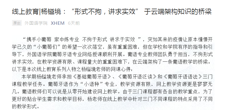 葡语专业教师杨镒境于外院微信公众号分享网络教学经验