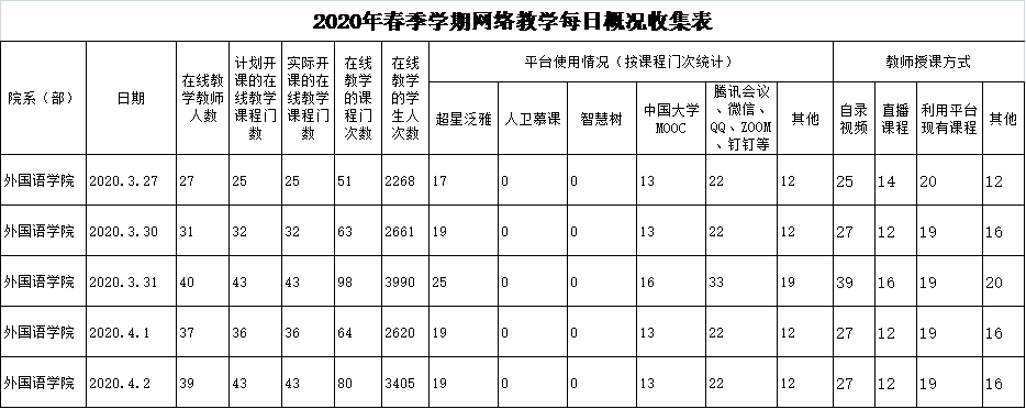 本周我院线上教学概况总体情况如下:线上开课总门数179,开课门次共356,平均每日线上授课教师人数35位,平均每日参与线上教学学生4989人次。教学设计方面,我院平均每日约20名教师使用超星平台或学习通、约14位老师使用到慕课课程、约24名教师使用腾讯平台工具(如QQ、腾讯课堂、腾讯会议等),每日约13名教师使用其他平台;授课方式方面,我院每日使用录播方式教师约29名、使用直播约13名、使用现有课程约19名、使用其他方式约16名(参考第二周周五至第二周周四《2020年春季学期网络教学每日概况收集表》)。