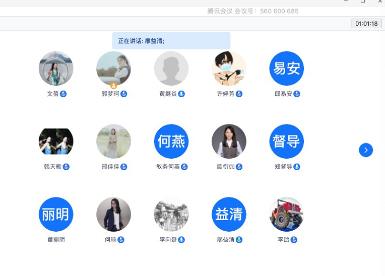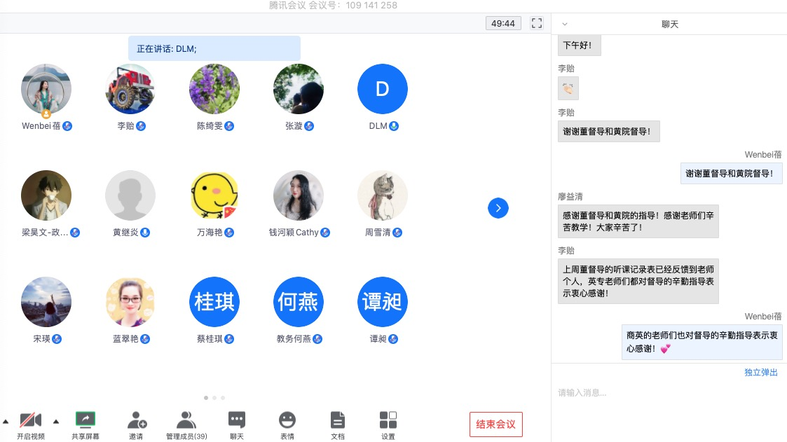 英语、商务英语专业的集体备课会议于本周三下午14:00在腾讯会议平台召开,此次会议上,廖益清院长提出网络教学期间各任课教师为上好课付出比线下教学更多的劳动,非常辛苦,非常感谢老师们的辛勤付出。督导们也肯定了我院的网络教学,课程设计清晰,文字互动活跃,课堂谈论有针对性。会议上各课程组也讨论了一下工作: