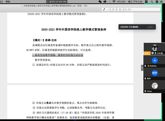 葡萄牙语专业的线上会议首先进行了集体备课、分享教学经验,接着专业负责人韩天歌老师带领各位专业课老师解读院里下发文件并提出以下几点工作: