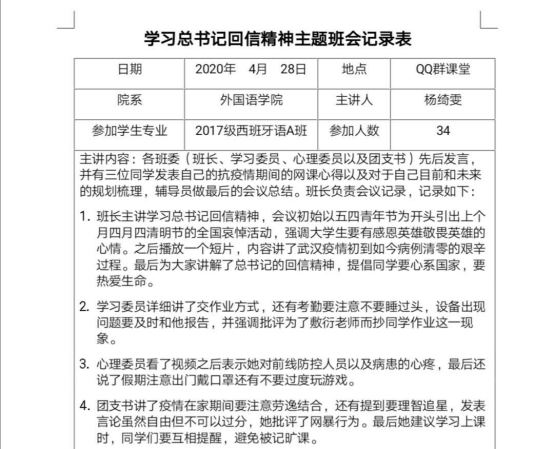 就在习近平总书记讲话后,班委们也以习近平同志系列重要讲话为主题给我们开了一次班会。此次班会以习近平总书记讲话为主题,围绕新冠肺炎疫情展开了主题班会,对我们广大青年大学生进行宣传教育。在习近平总书记的讲话中,首先我们要意识到的是加强疫情防疫工作中宣传教育和舆论引导的重要性。而全民的配合也就显得尤为重要。在宣传教育这一方面从“青年大学习—防控新冠状病毒肺炎疫情特辑”里可以看出贯彻的十分彻底,而每一期我也有认真仔细学习,相信绝大部份青年大学生也是如此。